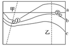 1.由于a、b、c所表示的数值由南向北逐渐减小,甲处的等压线由数值小的弯向数值大的,故图中甲处的虚线表示低压槽线;此地是北半球,结合地转偏向力知识,①处吹西南风;②处等压线稀疏,风力小,①处等压线密集,所以②处风速比①处小;乙在高压脊处,天气晴朗。