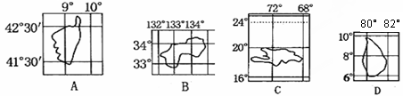 本题解析:试题分析:比例尺=图上距离/实际距离。四幅图中,图幅面积相差不多,而实际跨过的经纬度范围A图最小,所以,A图的比例尺最大。
