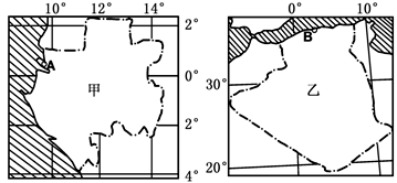 2、单选题 读两国轮廓图,A、B两城市分别是甲乙两国的首都,据此回答以下问题。