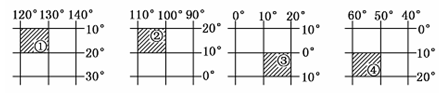 【小题2】在四幅图中斜线所表示的经纬线方格内,面积最大的是( )
