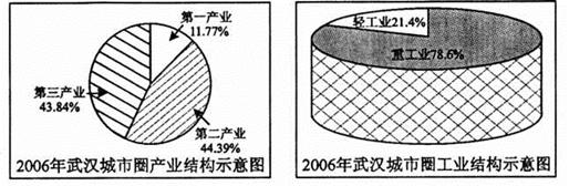 材料二:武汉城市圈是指武汉及其周边100千米范围以内的黄石、部州、黄闪、孝感、 咸宁、仙桃、潜江、天门8市,又称“1 +8”,该区域占湖北省33%的土地和51.6%的人口。 下图2006年武汉市城市圈产业结构示意图和2006年武汉城市圈工业结构示意图。