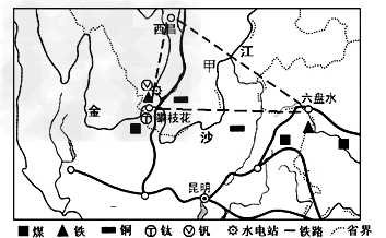 2、综合题 2012年2月,国务院正式批复同意《西部大开发》,“攀西-六盘水”(攀枝花-西昌-六盘水)资源富集区成为国家规划的西部重点开发区之一。根据下列材料结合所学知识,回答有关问题。