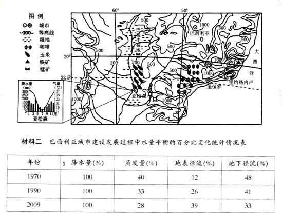 材料一 下图为南美部分区域及亚松森气候资料图。图中巴拉圭盆地内有世界面积最大的潘塔纳尔湿地,范围涉及巴西、玻利维亚及巴拉圭等多个国家。总面积达24200平方千米,是全球最丰富的水生植物分布地区。