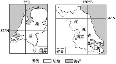 小题1:据材料1图,比较荷兰和江苏省地理位置的异同。