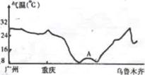 2、综合题 读某月份广州至乌鲁木齐一线气温变化图,回答下列问题: