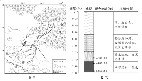 材料一:石羊河流域示意图(图甲)????????材料二:石羊河流域某采样点垂直剖面图(图乙)