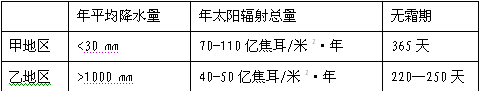 (2)甲、乙区域农业有共同的经济作物,结合材料二和所学知识说明与乙区域相比甲区域发展该经济作物的优势自然条件和限制性自然条件分别是什么?(6分)