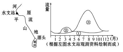 本题解析:试题分析:小题1:结合东北地区河流水的主要补给类型,图示③补给量大,且主要分布于夏季,故判断为夏季降水;②主要在春季形成补给,故判断为春季的积雪融水;而①补给终年较稳定,故判断为地下水补给。