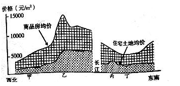 2、单选题  下图是某时期武汉市长江两岸城区商品房均价与住宅土地均价剖面示意图,读图完成下列问题。