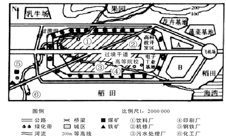 小题2:本题考查城市布局。根据图示:图中AB靠近飞机场,噪音污染大,不适合建设高级住宅区;过境道路会对城区交通造成影响,引起交通堵塞;根据图中等高线和河流流向判断,地势北高南低;乳牛场靠近公路,布局合理。所以本题选择C选项。