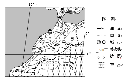 2009年,德国启动了开发非洲北部沙漠太阳能发电项目(DESERTEC),计划在北非沙漠地区建立太阳能电站,满足欧洲约15%的用电需求,其余供应电站所在国。经考察甲国将成为这一项目的最佳投资地。下图是甲国等高线地形简图,下表一是K港口气候资料表.