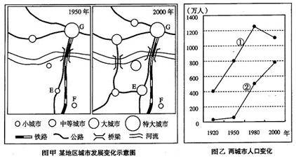 (2)乙图中的①②两线中,最有可能反映G城人口变化特点的是????线,20世纪80年代以来,G城的人口变化特点是??????????,其主要原因是社会、经济、环境问题突出,表现在??????????????????????????????等。(6分)