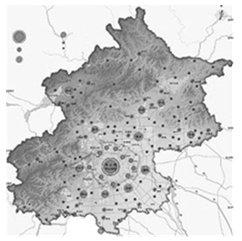 4、单选题  下图为北京地区城镇分布示意图(点的大小表示城镇规模,点越大规模越大),读图分析北京地区城镇分布的特点为