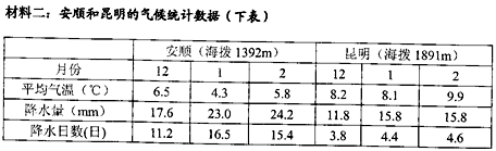 (1)图示准静止锋多出现于冬季,安顺与昆明相比,冬季气温 ,降水量 ,降水日数 ,从气团性质看,冬季影响安顺的气团是 。(8分)