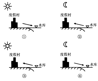 1、单选题  从交通运输部水运司获悉,三峡水库自2008年9月28日0时开始蓄水,11月5日8时已成功蓄水至172.41米,在狭窄的河流上出现了一个面积超过1 000平方千米的“湖泊”。巨大的水库也给周边气候带来一定影响,若在三峡水库边修建某度假村,下图中能正确反映水库与度假村之间风向的是(   )