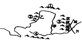 本题解析:试题分析:小题1:我国南北方分界线为秦岭一淮河一线。图中①为阴山,③为太行山,④为秦岭。。