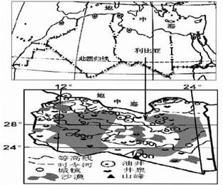 (2)此题运用地理环境的整体性理论,从气候、地形基本自然要素入手,再考虑植被、水文、土壤。依据位置,北部沿海平原紧靠地中海,故为地中海气候,夏季高温干燥,冬季温和多雨;南部地区离地中海较远,为热带沙漠气候,全年高温少雨。从图看出总体沙漠面积较大,气候总体特征是比较干旱的。根据图中的等高线分布情况可以看出:北部沿海为平原,但分布狭窄。越往南海拔越高,但等高线分布较稀疏,故南部地形主要为高原,内部相对起伏较小。综合气候和地形,从植被来看:北部为亚热带常绿硬叶林,南部热带荒漠,且分布面积较大;从水文来看:河流流程较短,多为内流河,且境内井泉较多。