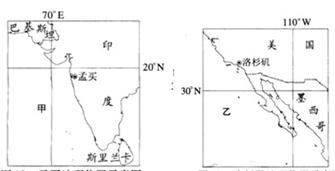 (2)甲海域位于北印度洋,夏季,受西南季风的影响,洋流呈顺时针;乙海域位于美国中低纬大陆的西岸,洋流为加利福尼亚寒流。