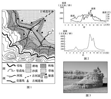 (1)图2中??????????(甲或乙)图所示河流与c河流的径流量年变化类似,该河流的最主要补给水源是????????????????。(2分)