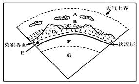 B.地球内部圈层由E、F、G三部分组成,其中G为地核