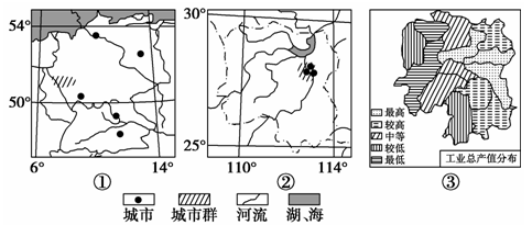 1.①②两图所示区域共同的自然特征是2.有关①②两区域的人文特征,叙述正确的是3.结合图②分析图③中形成工业总产值空间分布差异的主要原因是