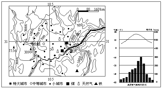 下左图为四川盆地等高线略图,右下图是重庆市气温降水柱状图。