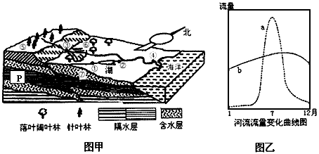 ??? A、图乙中b曲线反映了图乙中①处水文站的流量变化