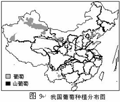 4、单选题 图9为“我国葡萄种植分布图”,回答问题。