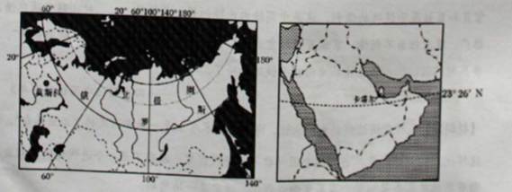 材料二: 2018年与2022年世界杯足球赛将分别在“航母”大国俄罗斯(面积1700万平方千米)和“袖珍”小国卡塔尔(面积1.14万平方千米)举办,下为俄罗斯和卡塔尔的区域位置图。