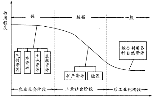 (3)工业社会阶段煤、铁、石油、天然气、铜、铝等矿产资源对资源性产业和工业布局有着决定性的影