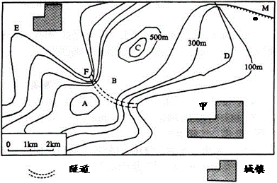 小题2:图中M处地形的海拔最高点相对于甲城镇的高度可能为: