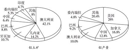 4、单选题 下图是“某年部分国家占世界铝土矿及铝产量的比重图”,完成问题。