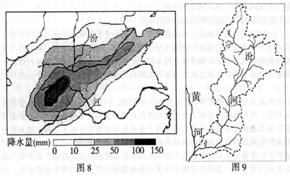 材料一:图8为2011年9月上旬我国部分地区强降雨量图,图9为汾河流域示意图