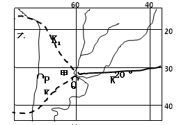 (1)曲线K表示1月份某局部地区20ºC等温线分布,虚线是有待确定的等温线走向。判断该等温线西半段走向,并说明理由。K曲线西半段走向是 (K1还是K2)曲线,理由是