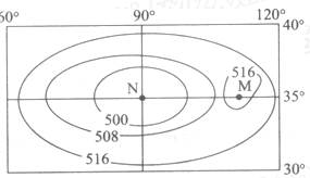 本题解析:【小题1】根据经纬度判断,图中N点对应的地面位于青藏高原,M点对应的地面位于山东泰山。海拔越高,气压越低,青藏高原的海拔高于泰山,故M处地面的气压高于N处地面。