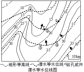 本题解析:1.本题考查等值线图的判读。根据图示:P点的海拔为15米,潜水位为10米,所以埋藏深度为5米;Q点的潜水位为10米;该地区等高线主要向高处凸,大部分地区为山谷;潜水的流动方向从高处往低处,和等潜水线垂直。所以本题选择A选项。