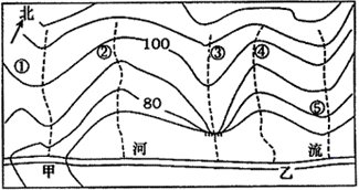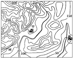 【小题2】M在甲村的正南可画出指向标,箭头应从M指向甲,乙的海拔可算出在50—100之间,河流应从高处流向低处,即从100流向50,把指向标平移到乙附近,可看出河流流向由西北向东南。