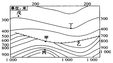 【小题1】图示等高距为100米,由图可知:乙处陡崖,缺失500米、600米等高线,即乙陡崖处是500米、600米和700米等高线交汇,由此可判断崖底的海拔400-500。选A正确。