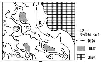 【小题2】图中,甲、乙、丙、丁四地点最可能形成瀑布的是(   )
