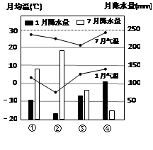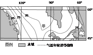 1.图示区域气温年较差空间分布的特点是2.图中甲地气温年较差比同纬度的其他地区大,其主要影响因素是3.下图示意某四地气候资料,其中与上图所示乙地气候特征最相似的是