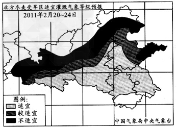 2、单选题 水分在地表结冰而不能渗入土壤,会使麦苗窒息或遭受冻害。为指导农民科学、合理地进行灌溉,中央气象台适时发布北方冬麦受旱区适宜灌溉气象等级预报。下图是中央气象台发布的2011年2月20日~24日的预报图,读图回答1—2题。?