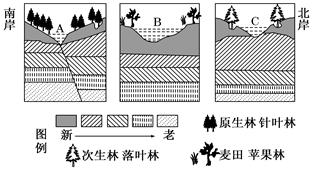 5、综合题 下图中的三幅小图为某自西向东流的河流上、中、下游三个不同河段处的河床剖面示意图。读图,完成下列内容 (16分)。