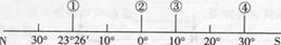 3、单选题 在东经30度经线上①②③④处各垂直竖立着一根旗杆,它们的高度相同,读图回答: