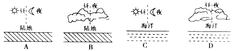 3、单选题 下图中A、B、C、D位于同一纬度其中昼夜温差最小的是
