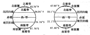本题解析:小题1:黄赤交角的度数等于回归线的度数,和极圈的度数互余,黄赤交角变大,热带的范围变大,极圈和极点之间的寒带范围变大。则温带变小。所以本题选择B选项。