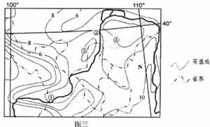 3、单选题  读我国某地区年平均气温等温线分布图(图三),完成6—8题。