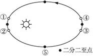 本题解析:从图中可以看出,离太阳较近的点是①②,①与②之间的点应是冬至,根据地球公转方向及近日点在1月初的知识,可知近日点为②点。