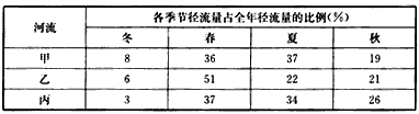 上图中甲、乙、丙三条河流径流量季节变化统计表