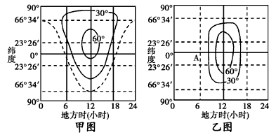 4、综合题  甲、乙两图是秋分日、夏至日的太阳高度分布示意图。读图回答下列各题。