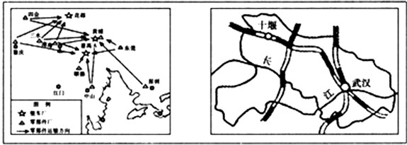 2、综合题 下图是日本丰田、本田、日产等三大汽车企业落户珠江三角洲地区分布图和我国二汽总部从十堰市迁往武汉市图。读图回答下列问题。
